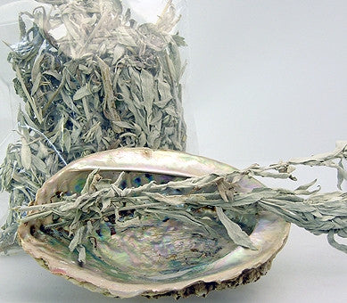 The kit consists of a whole abalone shell and a large handful of prairie sage (Artemisia ludoviciana).