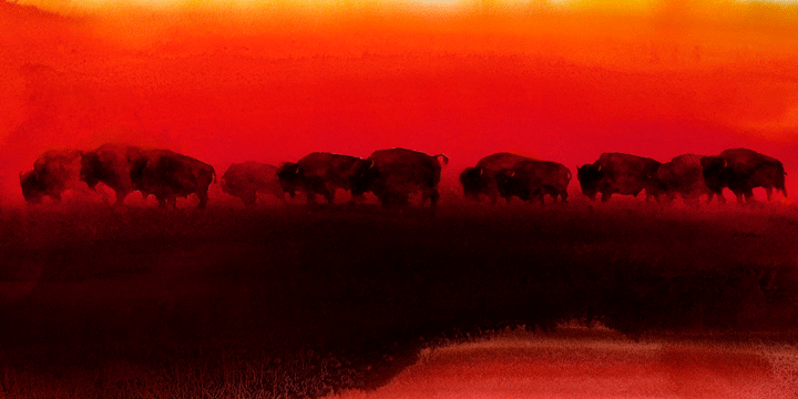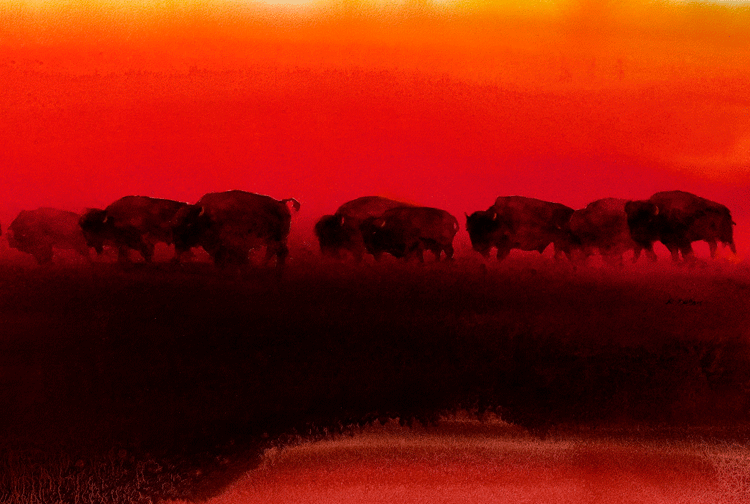 The dark of night is descending. A line of buffalo is looming on the horizon. They march a dark path within a crimson saturated sky in the dramatic image, “Tatanka Sunset.” The buffaloes appear in the upper half of the picture field, suggesting distance. Their shapes are sharp against the glowing dusk, and movement is visible in the artist’s use of line.