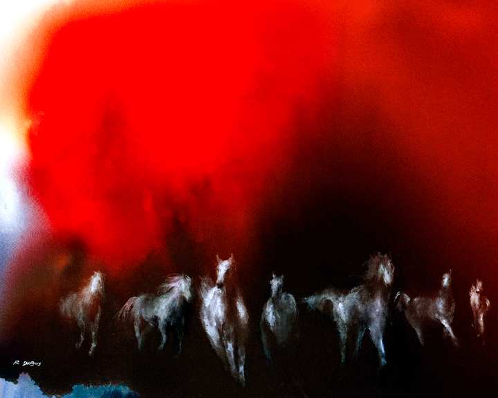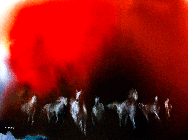 Horses burst out towards the viewer in the giclée print, “Wildfire,” by Richard DuBois.