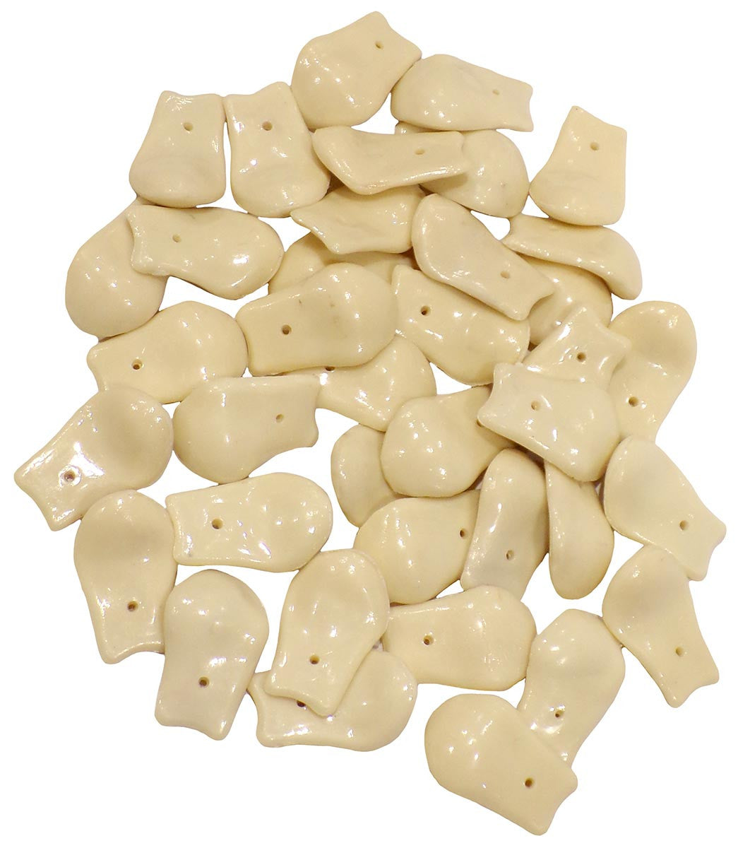 These imitation elk teeth are made from plastic, they are lightweight. The imitation teeth have a single drilled hole and can be used to decorate regalia or for jewelry making.