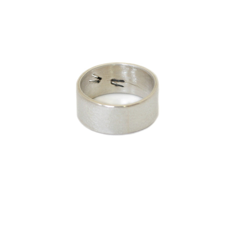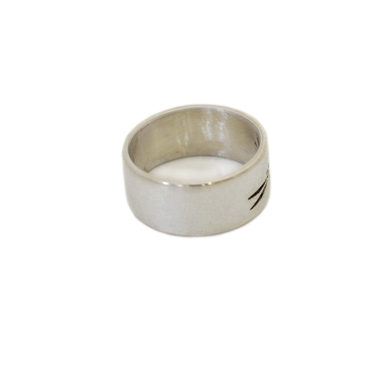 This Native American made ring features a slate patterned textured sterling silver background with an oxidized dragonfly design.