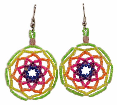 These earrings are made with bright neon green, yellow, orange, pink, purple, and blue beads creating a dreamcatcher design. They are finished off with French hooks.