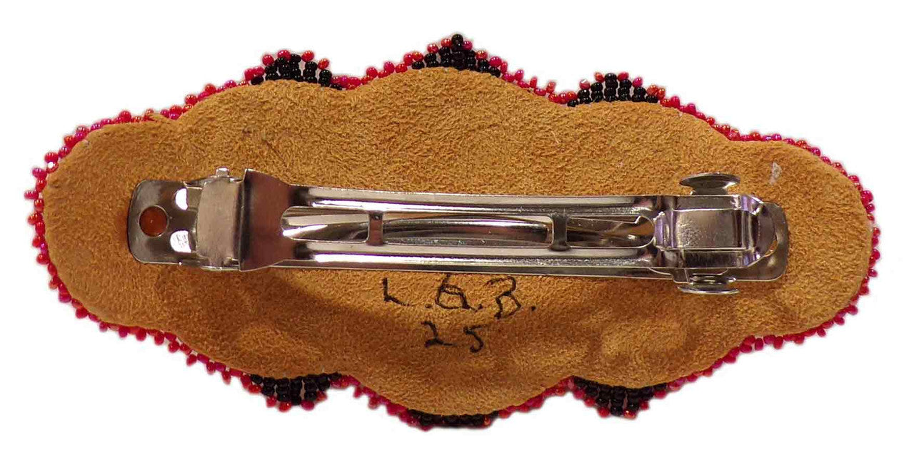 This hair barrette is hand made by artist Leonard Good Bear (Cheyenne River Sioux Tribe). He uses vibrant red, orange, yellow, black, and white beads to create the design. He also accents the barrette with porcupine quills, a soft leather backing and a French-style clasp. The piece is signed by Leonard.