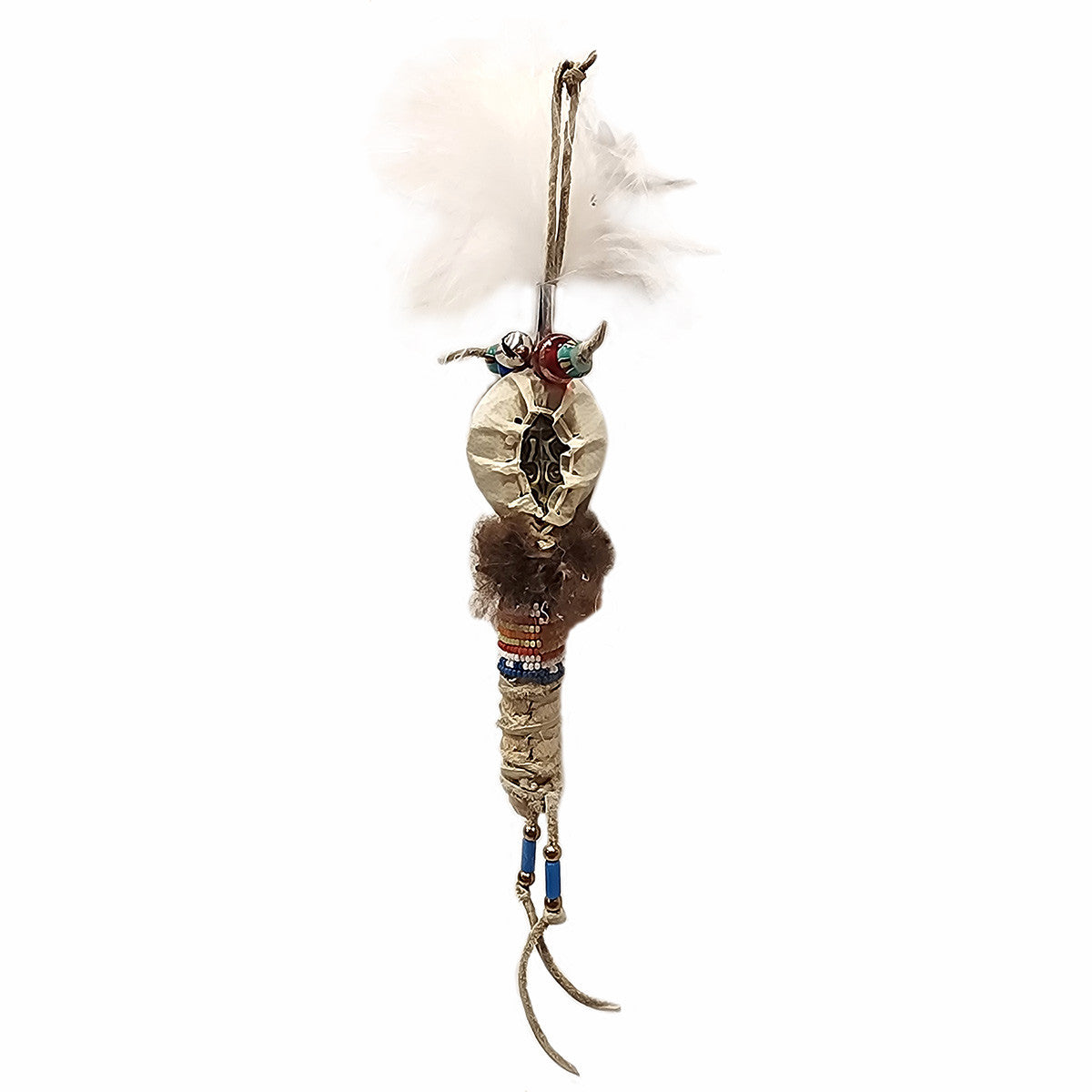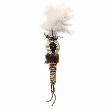 This mini rattle is hand made by Jeremiah Little Wounded (Cheyenne River Sioux Tribe). He utilizes a mini turtle shells, deer rawhide, mini sleigh bells, leather, tin cones, imitation eagle fluffs, and a combination of colorful beads to create the design.