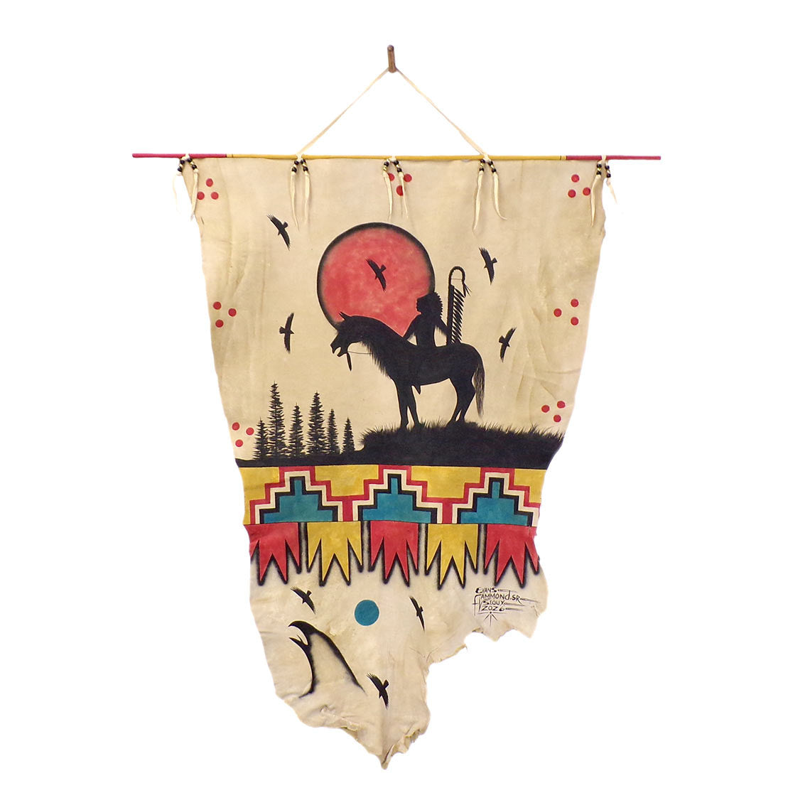 Evans Flammond Sr., Sicangu Lakota Oyate member, hand paints this commercially tanned deer hide with acrylic paint. The image is of a Chief on his horse in front of a large red moon.