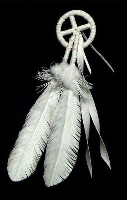 Entirely made of paper the “Medicine Wheel with Feathers,” by Patty Eckman (Non-Native American), is a limited edition cast paper sculpture that depicts the sacred object with cloth twists and eagle feathers dangling from the medicine wheel wrapped in porcupine quills.