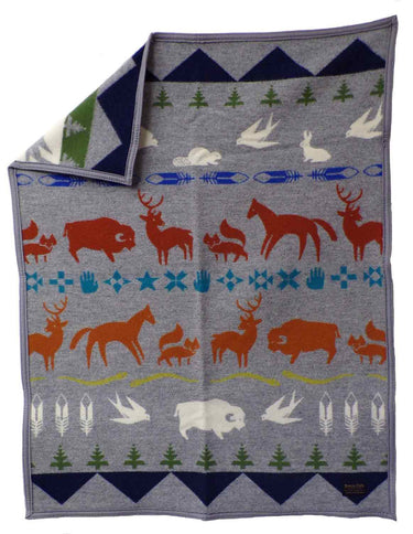 This baby sized blanket's design depicts all of Earth's animals moving together on many shared paths from the buffalo, fox, deer, and dove.