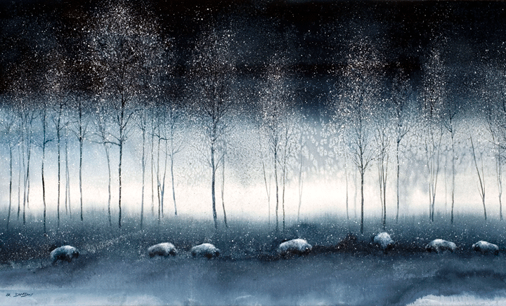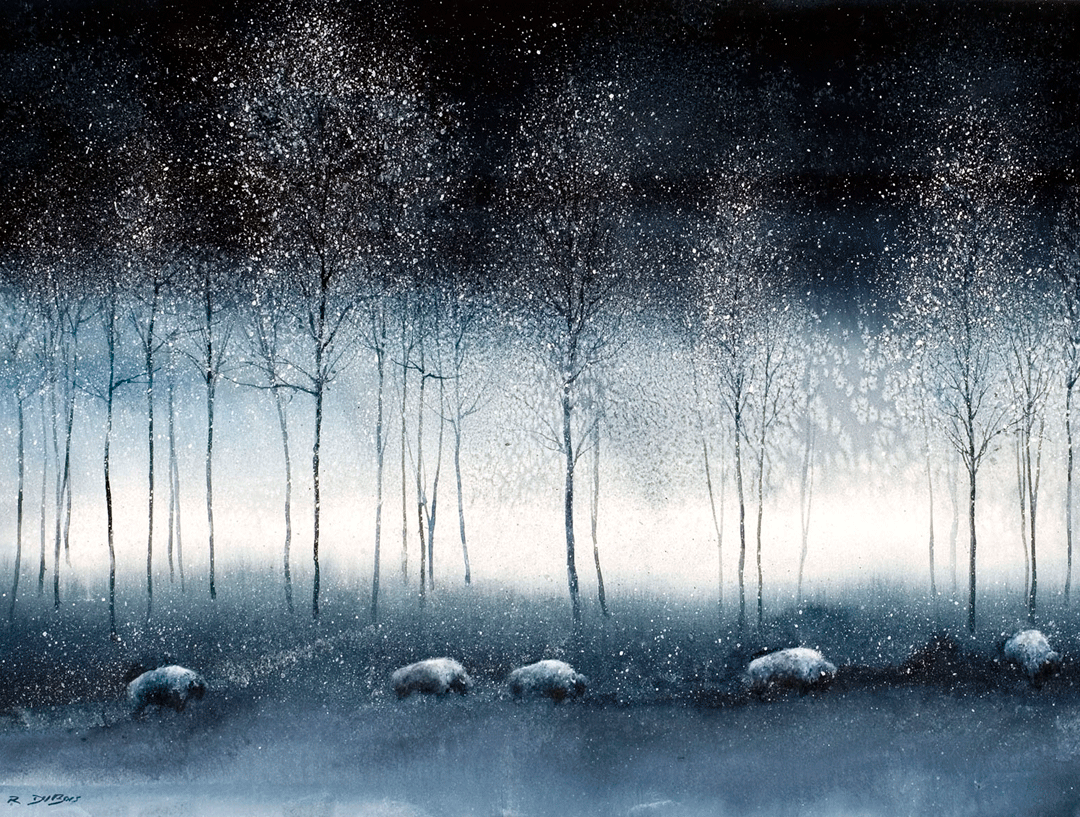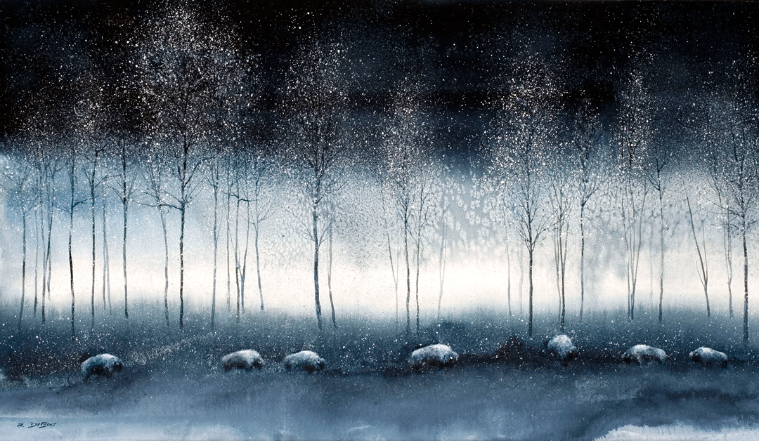 Richard DuBois was a college art professor and master watercolorist who painted this beautiful monochromatic image of bison in the Black Hills. His techniques in the medium allowed for such interesting texture and combined expansive color washes with subtle detail.