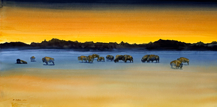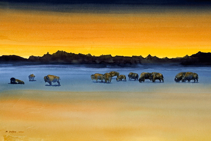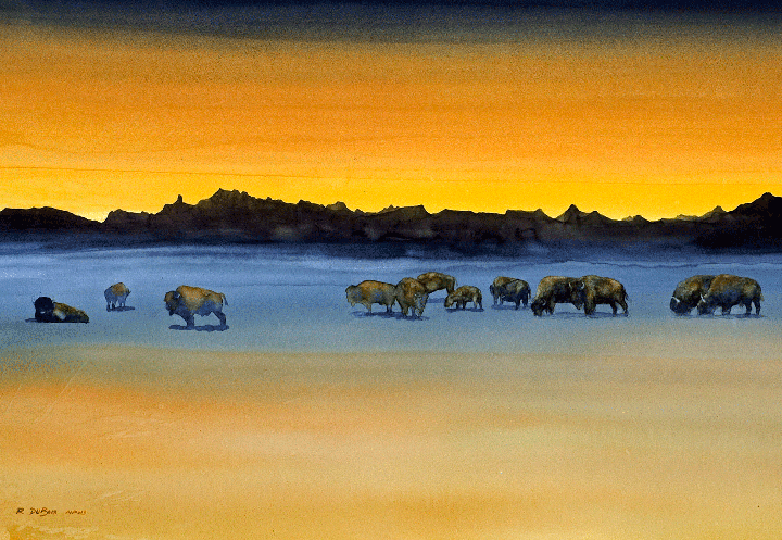 Watercolorist, Richard DuBois, used a limited color palette in, "Buffalo Hunters," to achieve the effect of the bison herd grazing at sunset.