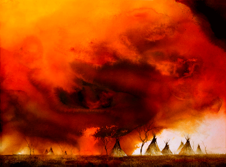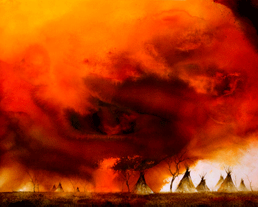 A group of Native American tipis are standing on the vast landscape in the giclée print, "Cheyenne Breaks" by Richard DuBois. The time is sunset, and the deep orange and red clouds are swirling above and beyond the encampment. Through his use of scale, and by using light color washes over some of the teepees, the artist captures how the big skies of the Plains almost overshadow and envelop the inhabitants of the land.